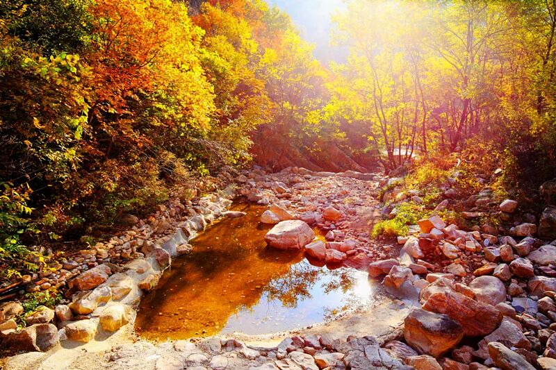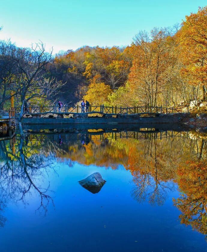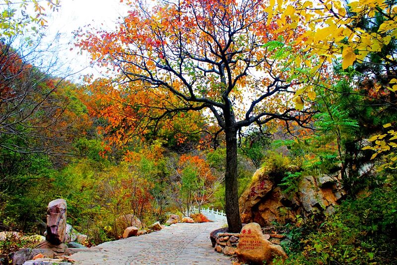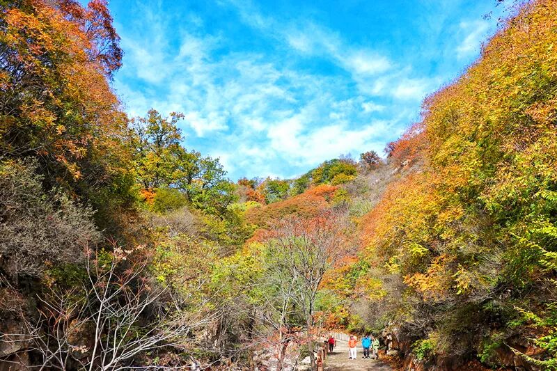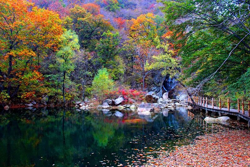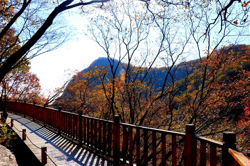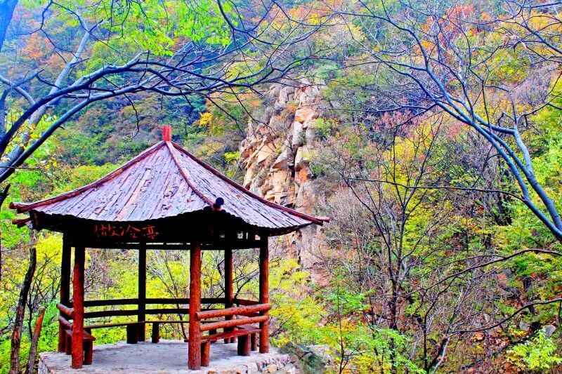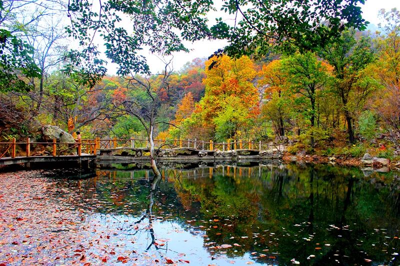作为大型原始次生林保护区,梨木台里生长着1000多种植物。因为山势蜿蜒,植被多层次分布,深秋时节,随着气温下降,五角枫、白蜡、栾树、国槐、核桃楸等叶子渐次红起来,整个山林呈现出层林尽染、秋叶斑斓的壮美景象。